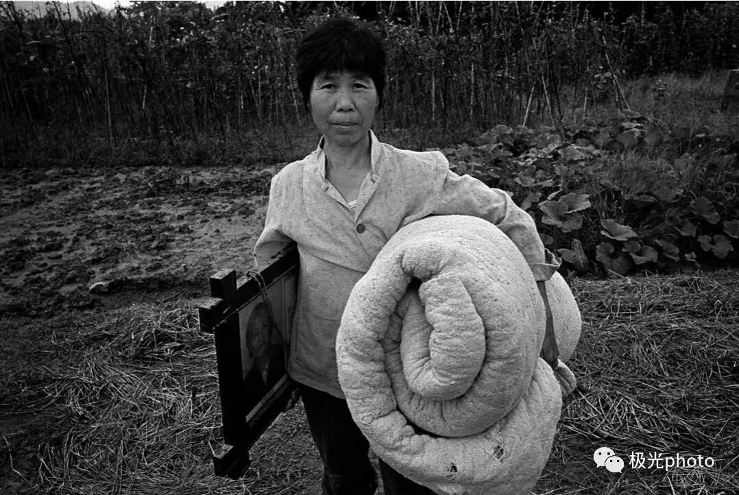 2002 年 8 月 26 日,丰稳坝雨中,殷永生的妻子陈光荣一手抱着一床棉絮,一手夹着一个像框,上面是他们逝去的老人的遗像。