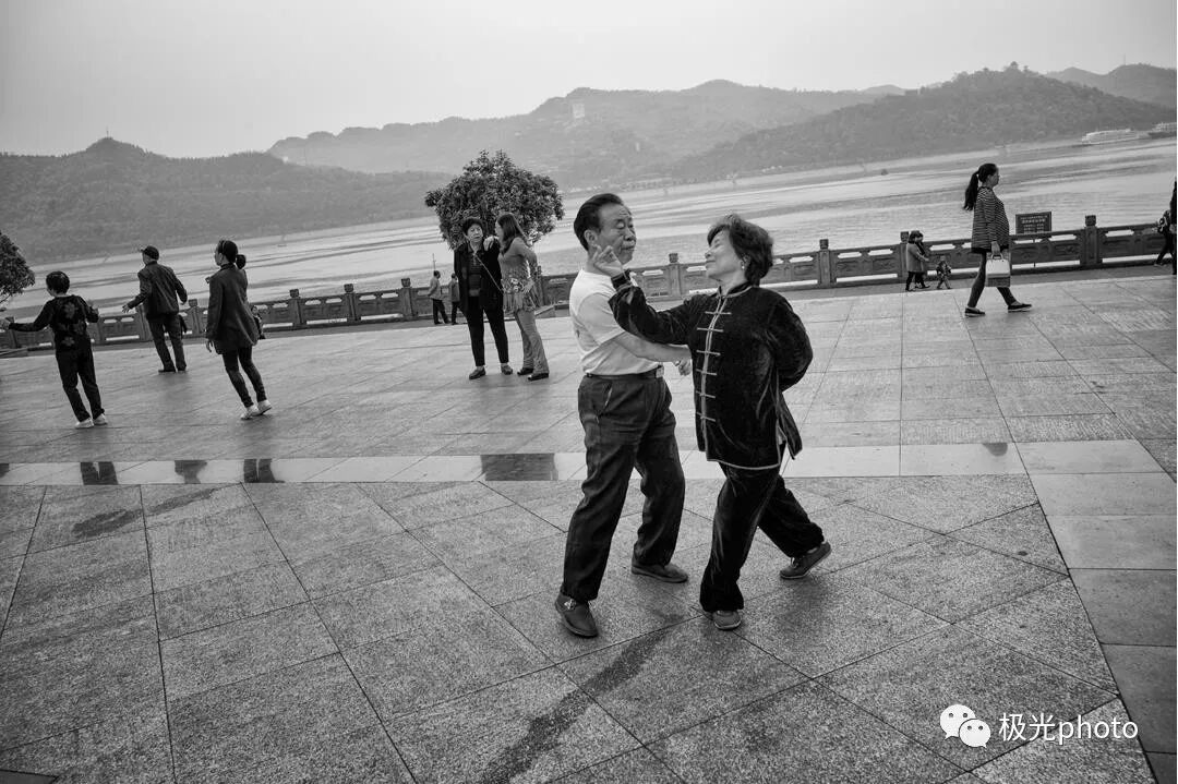 2016 年 4 月 12 日,72 岁的丰都老年协会交谊舞辅导站站长冉锡荣与搭挡 5 年的舞伴在丰都移民广场晨舞;从老城到新城;风雨无阻。