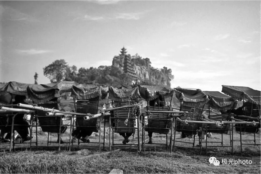 2002 年 10 月 11 日,忠县石宝寨渡口;女人一字排开纳鞋垫;男人一字排开的滑杆;远处是被称为人文奇观的石宝寨。
