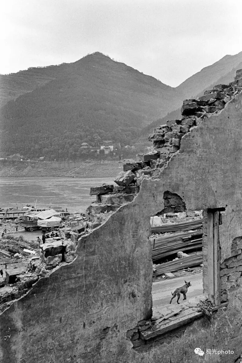 2002 年 5 月 6 日,云阳旧城;悠闲的野狗在残破的窗口里闪现;远处是即将搬迁的张飞庙。